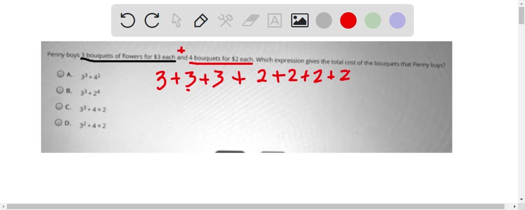 Solved Select The Correct Answer Penny Buys 3 Bouquets Of Flowers For 3 Each And 4 Bouquets For 2 Each Which Expression Gives The Total Cost Of The Bouquets That Penny Buys
